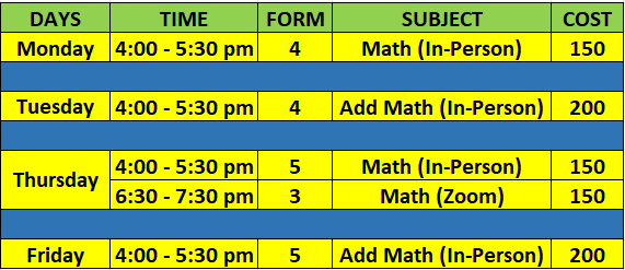 Form 4 and 5 Math and Add Math (In-Person), and Form 3 (Zoom) Lessons available. Classes resume in September. Contact Dr. Jogie @ 745-0232 for more information.